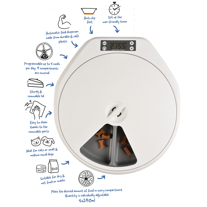• Futterautomat mit 5 separaten Fächern, von denen 4 abgedeckt sind (5 x 240 ml)