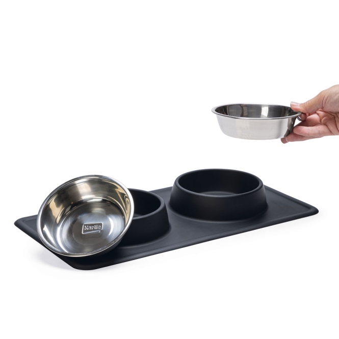 Mit dem Diner Set Dex von Karlie können Sie Ihren Hund mit Futter und Wasser versorgen. Dieses Set hat 2 herausnehmbare Edelstahlschüsseln. Diese Edelstahlschüsseln können in der Spülmaschine gereinigt werden. Edelstahl sorgt dafür, dass der Geruch von Hundefutter nicht aufgenommen wird. Der Rand von Dex ist aus rutschfestem Silikon, damit die Schale an Ort und Stelle bleibt. Außerdem sammelt die Silikonschale verschüttetes Wasser und/oder Futter auf.