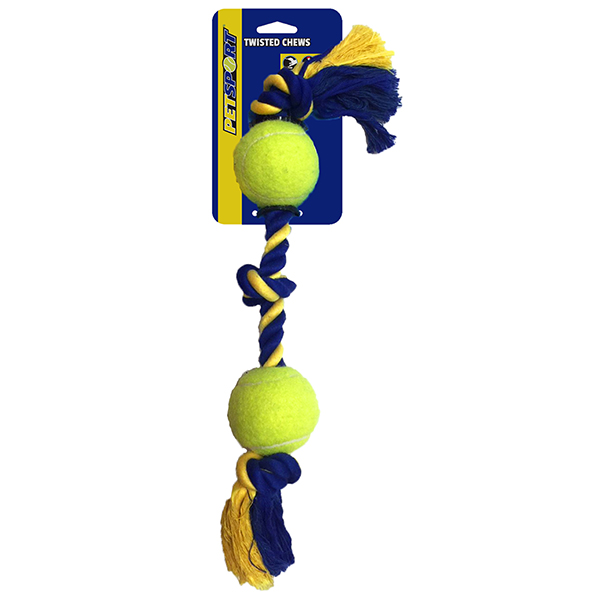 Medium-Baumwollseil mit 3 Knoten und 2 extra starken Tennisbällen Geflochtenes Seil gefertigt aus starker, „1st class“ Baumwolle. Es gibt viele Seilspielzeuge für Hunde auf dem Markt, jedoch wenige so gut wie dieses! Die blau/gelbe Farbe kann Ihr Hund z. B. auf Rasen besonders gut erkennen. Ausgestattet mit zwei hundefreundlichen Tennisbällen (extra dicke Wand) für langen Kau- und Spielspaß. Länge: ca. 43 cm Balldurchmesser: je ca. 6 cm