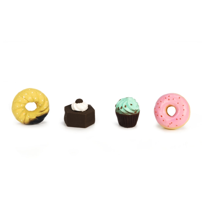 – Größenangaben: – Brötchen: 7,5 x 7,5 x 3,5 cm – Schokoladenkuchen: 7 x 7 x 5,5 cm – Muffin: 4x4x7 cm – Krapfen: 7,5 x 7,5 x 3,5 cm