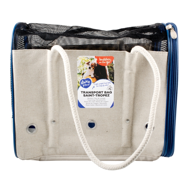 Mit dieser leichten und zeitgemäßen Reisetasche Saint-Tropez von duvoplus ‚Buddies on the go!‘ kannst du deine Katze oder deinen Hund überallhin mitnehmen. Diese qualitativ hochwertige und wasserabweisende Tasche ist aus Leinen gefertigt und verfügt über einen weichen Boden für zusätzlichen Sitzkomfort. Das herausnehmbare Kissen ist leicht zu reinigen. Die Oberseite ist mit Belüftungslöchern ausgestattet, damit dein Vierbeiner immer ausreichend Luft bekommt. Dank der robusten Tragegriffe kannst du die Handtasche überallhin mitnehmen. Die Tasche verfügt außerdem über eine zusätzliche Aufbewahrungstasche und eine Halsbandbefestigung. Sorgenfrei, sicher und bequem unterwegs! Geeignet für Hunde und Katzen bis max. 7 kg.