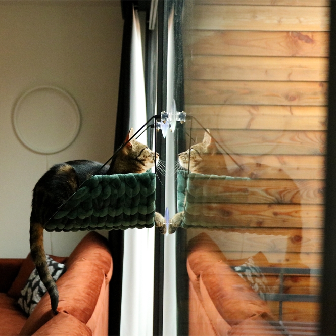 D&D Home Sofia ist ein modernes und stilvolles Katzenbett, das am Fenster befestigt werden kann, ein erhöhter Ruheplatz für deine Katze. Ideal für Katzen, die gerne alles im Haus und um das Haus herum im Auge behalten möchten. Das Bett besteht aus einem stabilen Metallrahmen mit 3 starken Saugnäpfen (Max. Belastbarkeit 10kg). Die Liegefläche wird durch ein geflochtenes Polyfiber-Velvetseil um den Rahmen gebildet. Dieses Bett wirst du nicht schnell an anderer Stelle finden und ist ein echtes „Dutch Design“-Produkt.