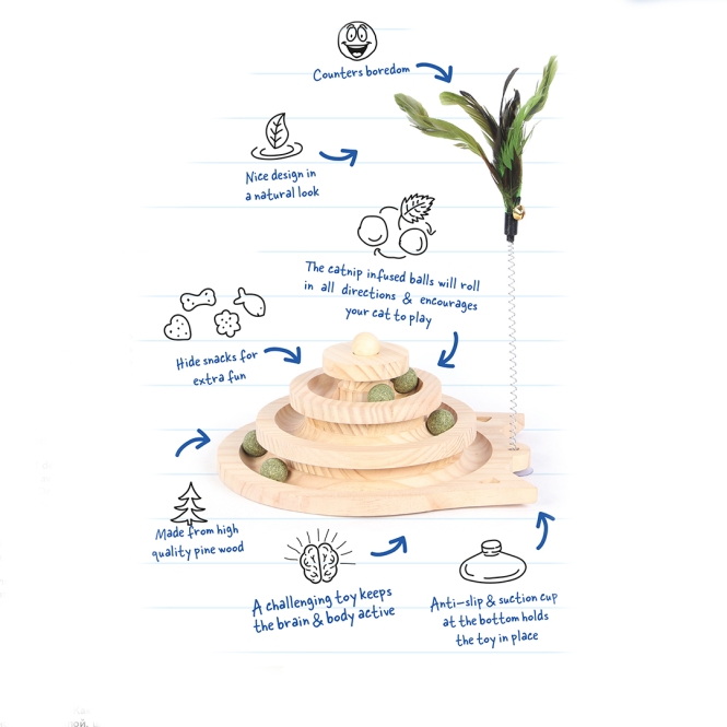 Halten Sie Ihre Katze bei Laune und animieren Sie sie mit diesem hölzernen Spin ’n play Spielturm von duvoplus. Ihre Katze kann einen der Bälle mit ihrer Schnauze oder ihrer Pfote berühren. Die Bälle rollen in alle Richtungen und sind zudem mit Katzenminze getränkt, um Ihre Katze zusätzlich zum Spielen und Bewegen anzuregen. Verstecken Sie leckere Snacks im Turm für noch mehr Unterhaltung! Der praktische Saugnapf an der Unterseite hält das Spielzeug an seinem Platz. Dieses hübsche Katzenspielzeug aus 100 % hochwertigem Kiefernholz ist eine ideale Ergänzung für Ihre Katze und Ihr Zuhause! Spaß garantiert.