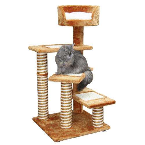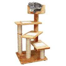 Dieser, in mediterranem Stil gehaltene Kletterbaum ermöglicht Ihrer Katze einen mühelosen Aufstieg in das hochgelegene Katzenbett in dem ein weiches Kissen liegt und das kuschelige Stunden beschert. Die Krallen können sowohl an den Stämmen, als auch an den eingearbeiteten Sisalflächen auf den Stufen, geschärft werden. – Höhe 100 cm – Grundplatte ca. 49 x 49 cm – Stufengröße: ca. 49 x 25 cm (mit einer Sisalfläche von ca. 22 x 20 cm) – Stamm 9 cm Durchmesser – Sisal an der Säule verklebt – Bett 35 cm Durchmesser – inkl. Kunststofffüße – Farbe: Terracotta