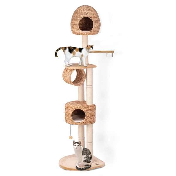 Der Banana Leaf Kratzbaum – das Original für Katzenliebhaber! Diese platzsparende Schlaf- und Kratzbaumkombination ist ideal für Wohnungen mit wenig Raum und bietet ausreichend Platz für bis zu zwei Katzen zum Spielen und Schlafen. Hergestellt aus hochwertigem Sisal und handgeflochtenen Bananenblättern, garantiert dieser Kratzbaum eine lange Lebensdauer und viel Freude für Sie und Ihre Katze. Das moderne Design in Beige fügt sich harmonisch in jede Wohnung ein. Die stabilen, mit Sisal umwickelten Stämme laden Ihre Katze ein, ihre Krallen zu wetzen, während zwei gemütliche Höhlen und eine offene Rolle perfekten Rückzugsort zum Schlafen und Verstecken bieten. Ein spielerischer Ball, der an einer der Höhlen befestigt ist, sorgt für zusätzlichen Spaß. Die mit weichem Plüsch bezogene Grundplatte sowie die Wandbefestigung garantieren einen sicheren Stand. Mit Gesamtmaßen von ca. 68 x 57 x 229 cm (LxBxH) ist dieser Kratzbaum nicht nur ein praktisches Möbelstück, sondern auch ein echter Blickfang. Entdecken Sie die Vorteile von nachhaltigen Naturmaterialien und geben Sie Ihrer Katze einen Ort, an dem sie sich geborgen und entspannt fühlen kann!