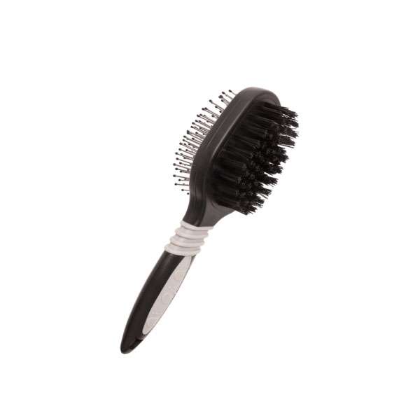 Die doppelseitige Bürste ist die ideale Komplettpflege für das Fell Ihres Hundes. Mit den Stiften auf der Vorderseite wird das Fell entwirrt und mit den Borsten auf der Rückseite wird es von Staub, Schmutz und losen Haaren befreit und es erhält sein strahlend glänzendes Aussehen. Der Anti-Rutsch-Griff sorgt dabei für eine gute Handhabung. Farbe: Schwarz-Grau Maße: ca. 19,5 x 6 x 6 cm (LxBxH)
