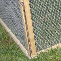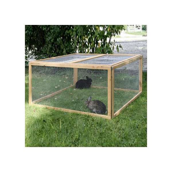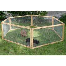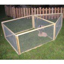 Das Freigehege Vario besteht aus 6 Elementen, die aus einem Holzrahmen mit Drahtgitter gefertigt sind, und 6 Erdspießen zur Befestigung im Boden. Die Elemente können in Ihrem Aufbau nach Belieben kombiniert und variiert werden (siehe Bilder). So können Sie das Freigehege genau nach Ihren Wünschen und Anforderungen aufstellen, z.B. zum Schutz vor Raubvögeln Elemente als Abdeckung verwenden oder mehrere Tiere trennen. Die Lieferung erfolgt zerlegt im Karton. Maße: 120 x 120 x 59 cm (LxBxH)